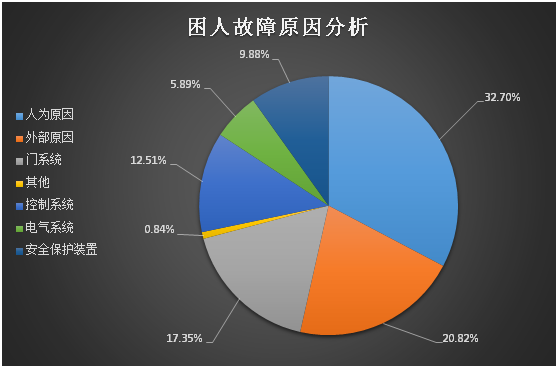依据《电梯应急处置平台技术规范》(CPASE M001—2019),在人为原因、外部原因、门系统、曳引系统、导向系统、轿厢、控制系统、电气系统、安全保护装置九类故障中:人为原因故障(311起,占32.70%)、外部原因故障(198起,占20.82%)、门系统故障(165起,占17.35%)居前三位,其中生活(装修)垃圾导致开关门受阻困人255起、停电困人107起、门锁失效114起。