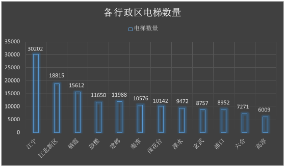 南京市12个行政区在用电梯分布情况如下,其中江宁区电梯数量最多30202台;高淳区电梯数量最少6009台。