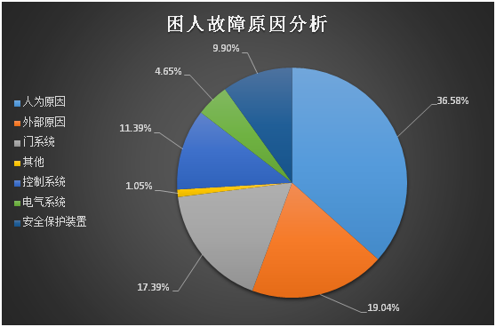 依据《电梯应急处置平台技术规范》(CPASE M001—2019),在人为原因、外部原因、门系统、曳引系统、导向系统、轿厢、控制系统、电气系统、安全保护装置九类故障中:人为原因故障(244起,占36.58%)、外部原因故障(127起,占19.04%)、门系统故障(116起,占17.39%)居前三位,其中生活(装修)垃圾导致开关门受阻困人216起、停电困人72起、门锁失效80起。