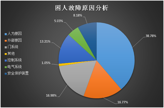 依据《电梯应急处置平台技术规范》(CPASE M001—2019),在人为原因、外部原因、门系统、曳引系统、导向系统、轿厢、控制系统、电气系统、安全保护装置九类故障中:人为原因故障(185起,占38.78%)、门系统故障(81起,占16.98%)、外部原因故障(80起,占16.77%)居前三位,其中生活(装修)垃圾导致开关门受阻困人165起、停电困人43起、门锁失效49起。